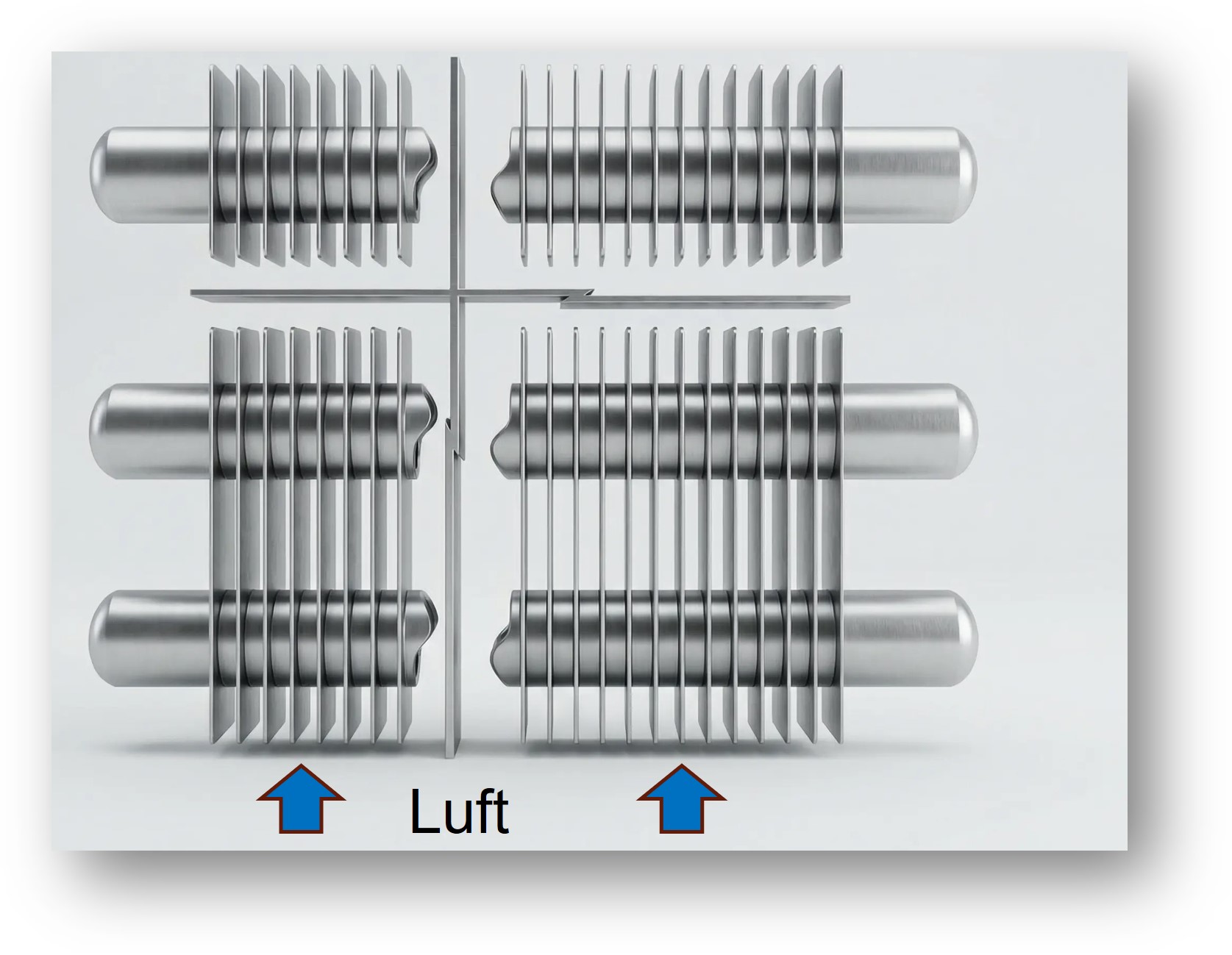 Die gezielte Versetzung identischer Lamellen erweitert die thermisch hochwirksamen Eintrittsbereiche und erhöht die lokale Wärmeübertragung.